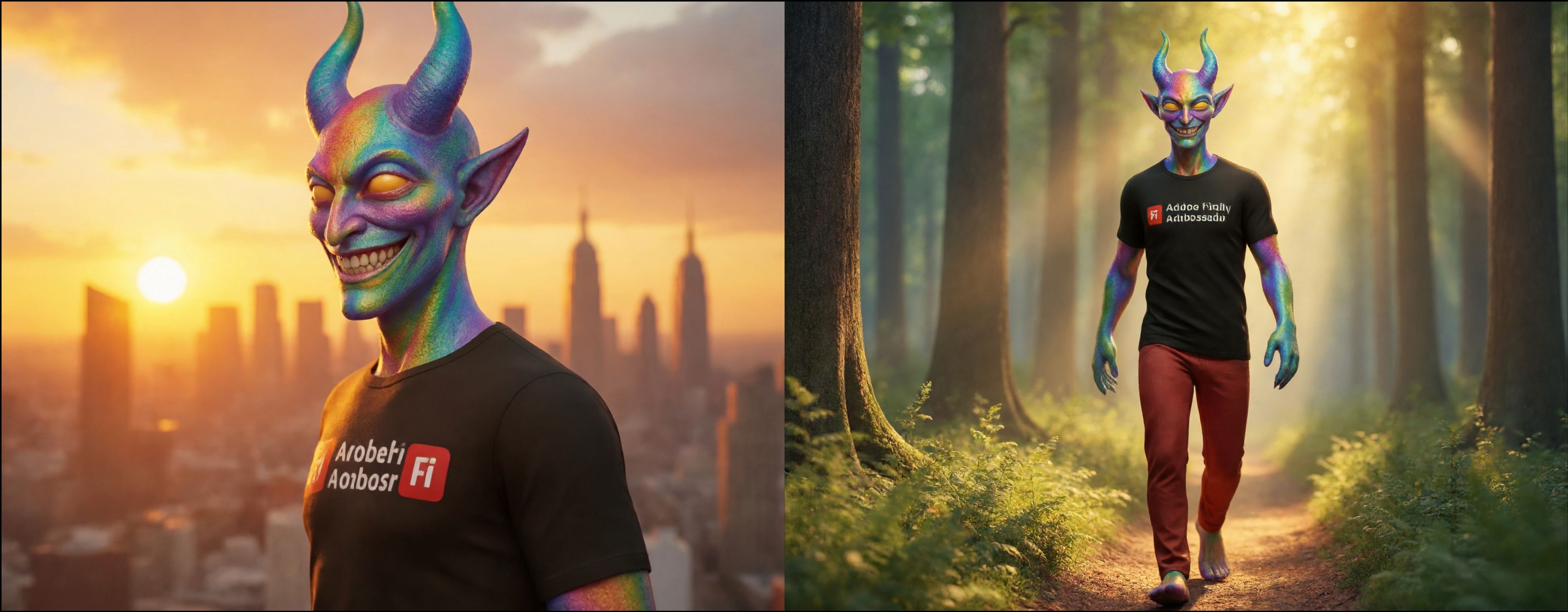 One problem: the shirt text. "Adobe Firefly Ambassador" came out as "Adobe FlxOl Antbossador." Every single front-facing image in the entire test had garbled text. The model learned that the shirt has a red square icon on the left and two lines of white text on the right. It did not learn what the text says.