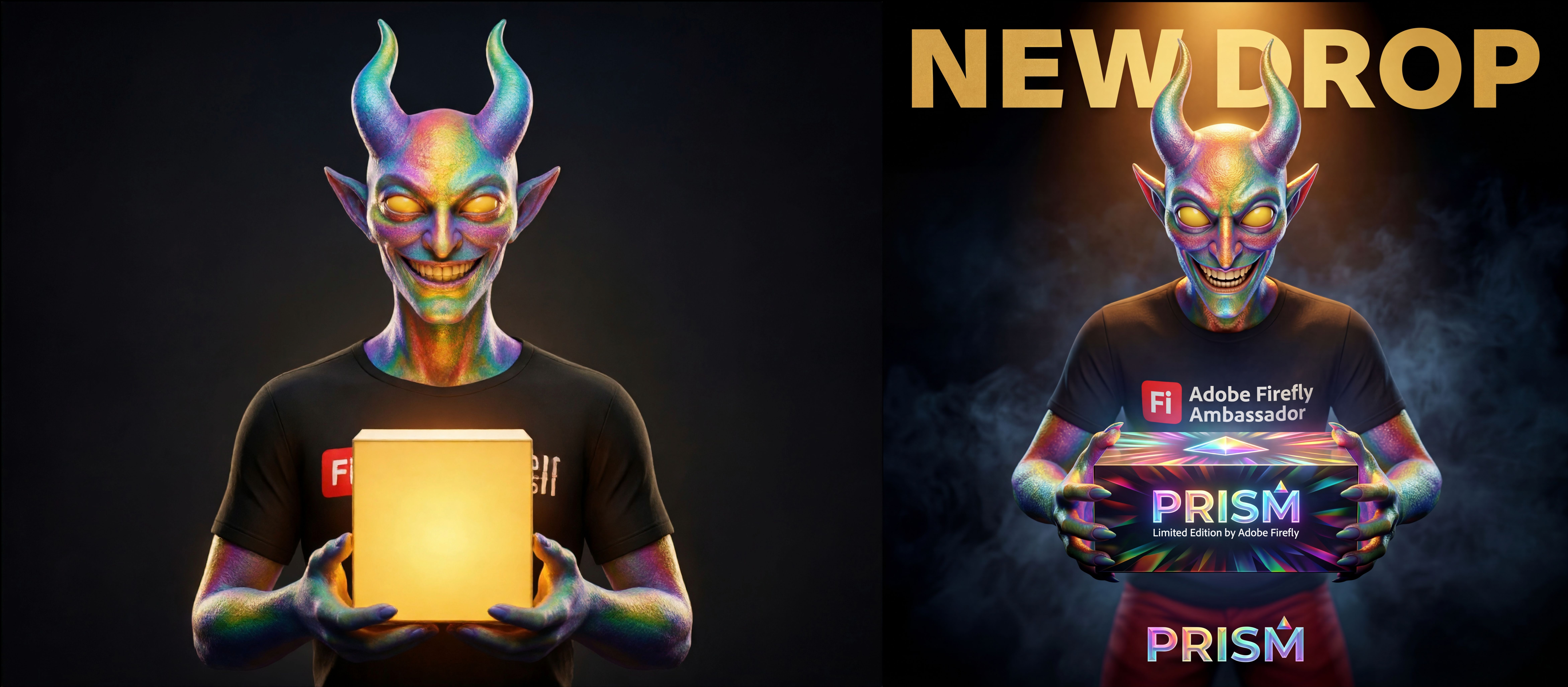NB2's Thursday version of the same prompt? "PRISM KIT | Premium Creative Tools." Geometric logo icon. "Limited Edition by Adobe Firefly." Full packaging design.