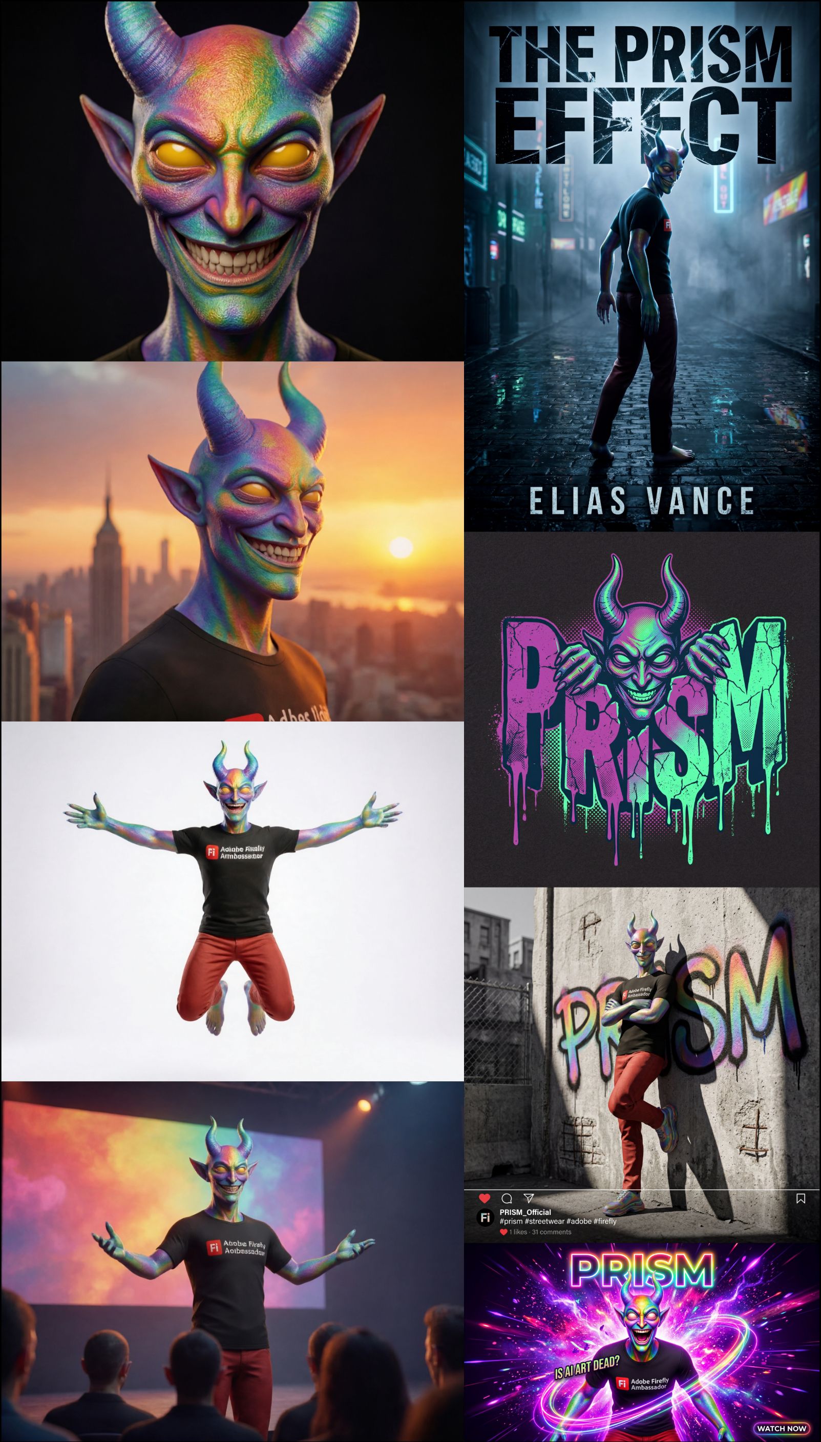 Three Prisms. One image. All recognizably the same character. The stress test passed. Later-generated figures drift slightly (rightmost is shorter, thinner, muted), but the identity holds.